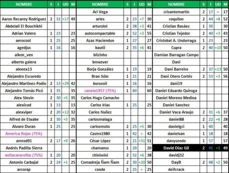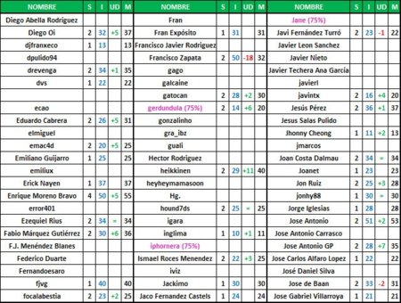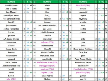Las tablas que os dejamos a continuación tienen a todos los que se apuntaron al reto en un principio pero aquellos que tras la tercera semana del mismo no nos hayan mandado ningún resultado los borraremos ya que tenemos pensado hacer unas tablas más elaboradas. Los resultados los podéis mandar hasta el viernes, bien de la semana uno, dos o de la tres.