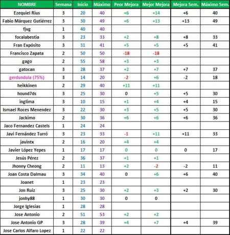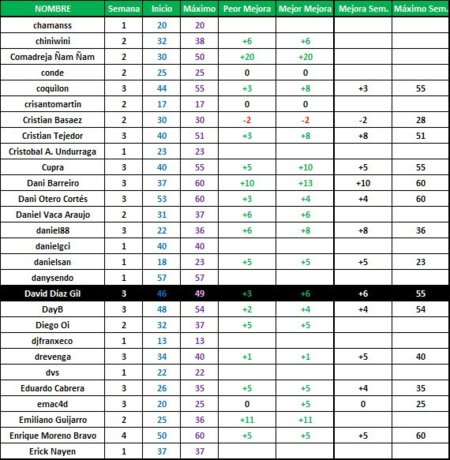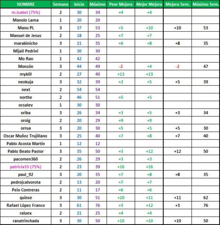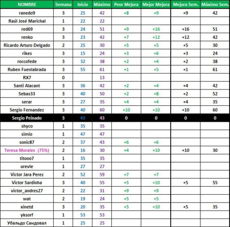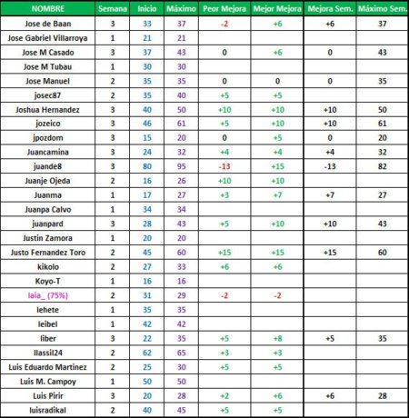 Aquí os dejamos las tablas actualizadas con los resultados de todos los que seguimos aún el reto (nos congratula saber que todavía somos muchos los valientes que seguimos semana a semana el reto. Si veis algún error o tenéis alguna duda ya sabéis que estamos a vuestra entera disposición para corregirlo y echaros un cable.