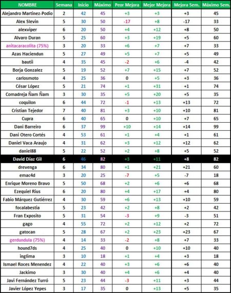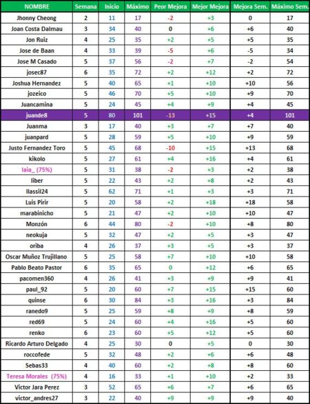 En lo que a mí personalmente me ataña he tenido que estar toda la semana sin entrar ya que me he lesionado el tríceps jugando a frontenis (no se puede dar tan fuerte a la pelota sin calentar que uno ya tiene una edad) y, aunque ya estaba en las 82, mañana intentaré hacer la prueba de esta semana pero seguramente no mejore mi registro o me quede aún muy lejos del mismo. El resto de vosotros vais muy bien, seguís luchando contra vosotros mismos que es el verdadero reto. Hemos limpiado las tablas y aquí van vuestros resultados: