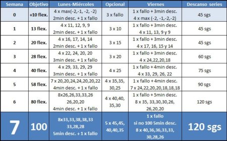 Aquí tenéis las tablas de las semanas para que las podáis seguir realizando el reto por vuestra cuenta. Recordar para los nuevos las pautas básicas están en el resto de post, pero el fallo es hasta que no se puede realizar más, los días opcionales se hacen martes, jueves y viernes cuando se puede pero no es obligatorio, con ellos se mejora más, y la primera semana o semana 0 es para los que no hacen ni diez (sustituir max por el número de las que hacéis):