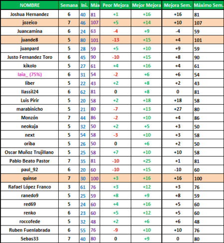 Y os dejamos la última tabla actualizada con los resultados de los que habéis seguido el reto hasta el final o casi hasta el final (yo después de 5 semanas parado por el tema pericarditi,s cuando iba 82 flexiones, he probado esta semana y he hecho 62 solamente así que cuando me recuperé del todo intentaré retomar el reto):