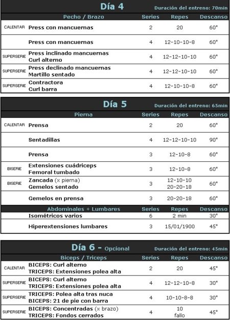 Acordaros que en cada ejercicio hay que ir subiendo el peso paulatinámente con el fin de llegar al fallo en la última repetición de la última serie. Tambié a partir de esta semana os recuerdo que BISERIE quiere decir dos ejercicios seguidos del mismo grupo muscular y SUPERSERIE dos de diferente grupo. Para TRISERIE o SERIE GIGANTE puede ser el mismo o diferente grupo.