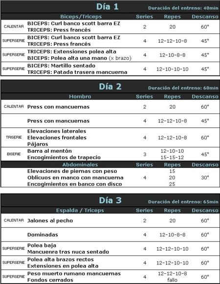 Esta rutina, como hemos comentado nos sirve para darle un empujón al brazo, trabajndolo 2 veces a la semana, y una tercera opcional el sábado en caso de ver que se peude incidir un poco más de trabajo sobre ambos grupos musculares: bíceps y tríceps.